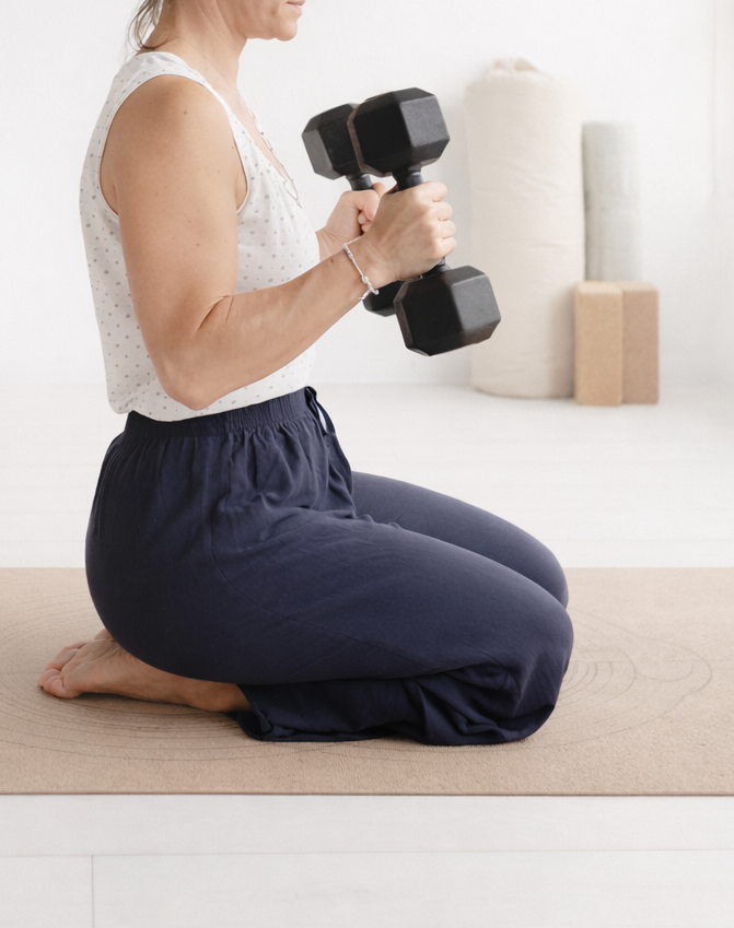 du renforcement musculaire cosy à la maison, avec de vraies charges, mêlé à des mouvements fluides inspirés du yoga.